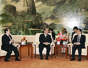 President Hu Jintao met with the secretary-generals of Japan's two ruling parties in Beijing Sunday, and called on both sides to work for the long-term healthy and stable development of bilateral relations.