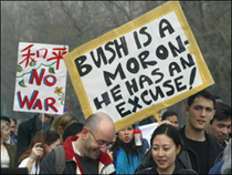 Some of the protesters were Arabian. They held high national flags of their respective countries or placards written in Arabic telling "We want peace", "Americans leave Iraq", shouting "We don't want war".