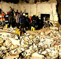 Dazed and wounded people stumbled from the wreckage, marked by a jagged, 20-foot-wide crater. A father cradled his young daughter, who was limp in his arms. Coated in dust, some rescuers dug through the debris with bare hands as uniformed firefighters fought the blaze and ambulance workers stood by with orange stretchers.