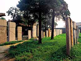 The Confucian Temple, in the center of Qufu City, was built in 478 BC. There are still 466 halls, pavilions and other rooms intact, covering a total area of 21.8 hectares. Repeated improvement and expansion has turned the temple into a palatial complex with nine rows of courtyards. The Great Accomplishment Hall, the major structure of the temple, is 33 meters tall. It is roofed with yellow glazed tiles and has octagonal eaves. The front 10 stone columns are carved with dragons. In addition to a statue of Confucius, the hall also houses stone inscription of the Ming Dynasty, which tells the life story of Confucius in 120 pictures, as well as a great deal of stone tablets.