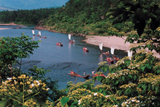 The Nanxi River is located in the county of Yongjia, Zhejiang Province, 23 kilometers from the city proper of Wenzhou. Flowing eastward for 150 kilometers and containing 36 bends and 72 shoals, the river and its banks form the Nanxi River Scenic Zone, which covers an area of 625 square kilometers, and is one of China's famous state-level scenic zones. With beautiful natural and man-made landscapes, as well as countryside scenes, the zone has more than 800 scenic spots scattered in its seven major tourist areas, including the Nanxi River, Yantou, Shiweiyan, Shuiyan, and Sihai Hill.