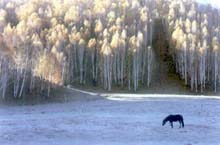 The road to Hanas Lake after Burqin County is lined with white birches. Hanas Lake is the most beautiful spot in northern Xinjiang. It was formed from melted snow and is tucked away among a vast expanse of trees 1,374 meters above sea level on Altay Mountain. The wild flowers that blossom in summer turn the land around the lake into a huge colored carpet. Hanas Lake is shrouded in mystery because of a legendary monster said to live in it.