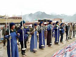 Part of the renovation work involves the Tibetan traditional architectural technique of building roofs and floors by stamping "agar." This is manually stamping a mixture of earth, crushed stones and cement on ground or on roofs, resulting in a surface as solid and smooth as marble. The procedure involves about a dozen people standing in two lines, each with a wooden log in hand to stamp the earth and crushed stones beneath their feet. They move rhythmically while chanting in unison, which makes the tough work resemble a dance performance.