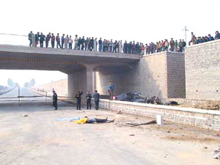 Police officers survey the scene of a car-train collision in Beijing's suburb Shunyi November 3, 2004. The car driver, identified later as Lu Yantao was killed in the accident.