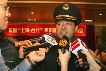 Guan Weidong, general manager of the Shanghai flight department of China Eastern Airline, answers questions at the ground service agreement signing ceremony in Shanghai January 19, 2005. Guan will be the captain of China Eastern Airline's first direct flight to Taiwan later this month.