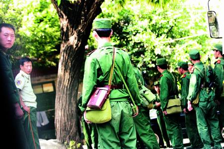 Police armed with live ammunition waiting at the foot of Mount Tai.