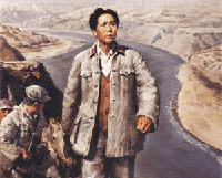 One of the major workers on the exhibition is an oil painting called "searching the truth", which depicts a senior Chairman Mao reading under the light on a much patched-up bed that is filled with books.