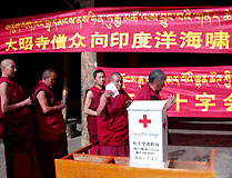 Des moines font des dons le 7 janvier pour les pays frappés par les tsunamis lors d'une activité de donation dans le temple Jokhang à Lhasa, chef-lieu de la région autonome du Tibet.