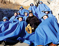 La forme ressemble à un epiphyllum en floraison tandis que les personnes sous la cape bleue paradent à la section de Jinshanling de la Grande Muraille au nord de Beijing. Cette cape exprime la paix sur cette ancienne forteresse qui autrefois repoussa les invasions.