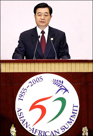 Le président chinois Hu Jintao a indiqué vendredi 22 avril que les pays asiatiques et africains devraient suivre de manière vigoureuse l'Esprit de Bandung, saisir l'opportunité historique et renforcer la solidarité et la coopération dans le but d'amener un nouveau type de partenariat stratégique Asie-Afrique.