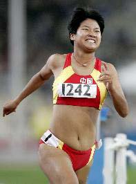 The 21-year-old from northern China's port city of Tianjin sprinted to the finish line some eight meters ahead of the competition to clock a new world record of 13.88 seconds. She set the previous record of 14.56 in October last year.