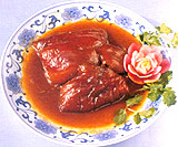 1. Das Eisbein und die Schweineknochen waschen und eventuelle Borstenreste entfernen. Die Schweineknochen auf den Boden eines tiefen Topfes legen, das Eisbein darüber legen, mit Brühe auffüllen, auf starker Flamme aufkochen lassen und Schaum absch?pfen. Dann den Reiswein, Ingwer, Porree, Salz und den Kandiszucker hinzufügen und auf schwacher Flamme schmoren lassen. Wenn das Eisbein gar ist, wird es herausgenommen und auf einen tiefen Teller gelegt.