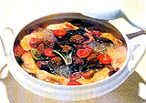 4. Die Hühnerbrühe absch?umen, die Glasnudeln, Pilze, Seegurken, Bambussch?sslinge und den restlicher Porree zugeben und wieder aufkochen lassen. Wenn die Krabben und Pilze zu duften beginnen, werden da restliche Salz und Glutamat sowie Schinken, Fleischb?llchen, Eierkuchen und die Tomaten zusammen zugegeben. Das Sesam?l darüber tr?ufeln und den gesamten Topfinhalt in eine Schüssel füllen.