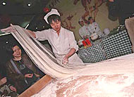 ?Die Zubereitung der feinen Nudeln ist tats?chlich ein Meisterstück, das die Zuschauer erstaunt. Besonders magisch ist die Herstellung von Dao-Xiao-Mian-Nudeln und La-Mian-Nudeln. Ein geübter Koch kann den Teig mehr als 30 Mal ziehen, bis sich der Teig endlich in Tausende Nudelf?den verwandelt. Der mit Zauberkraft zu Tausenden F?den gezogene Teig sieht dann aus wie Seide. Ohne flei?iges üben, mehr als 5 Jahre sind erforderlich, schafft es ein Koch auf keinen Fall, einen Teig zu seidenartigen Nudelf?den zu machen."