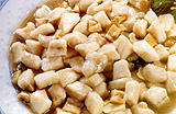 2. In einer anderen Schüssel die Sojaso?e, den restlichen Reiswein, Brühe, den restlichen Teil des St?rkemehls, Glutamat und das Sesam?l gut vermengen. Die Wasserkastanien sch?len und in kleine Würfel schneiden. Den roten Paprika feinhacken.