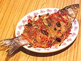 3. Das ?l bis auf einen kleinen Rest aus dem Wok gie?en und die Paprika-, Zwiebel- und Gemüsepaprikaschnitzel dazugeben. Abschmecken und anschlie?end die Sojaso?e, Reiswein, Zucker, Glutamat, Ingwer und Wasser (nach Bedarf) hinzufügen. Wenn die Brühe siedet, kommt noch die St?rkemehl-Flüssigkeit zum Andicken hinzu. Mit dieser Brühe wird der Fisch dann übergossen und zu Tisch gegeben.