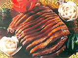 1. Das saubergewaschene Rindfleisch am Stück im sprudelnden Wasser gar kochen, herausnehmen und waschen. 2000 g Wasser in einen Topf geben und mit dem Rindfleisch, Porree (25 g) und Ingwer (1 g) zum Aufkochen bringen. Absch?umen, den Topf mit einem Deckel verschlie?en und bei schwacher Flamme 2 bis 3 Stunden schmoren lassen. Das Fleisch herausnehmen und abkühlen lassen und die Brühe griffbereit stellen. Das Fett und faserige R?nder vom Rindfleisch entfernen und das Fleisch in Streifen (8 X 3 X 0,5 cm) schneiden. Mit dem glatten Fleischseiten nach unten in einer Schüssel anrichten und die H?lfte der Sojaso?e, Salz, Reiswein, Porree (25 g), Ingwer (4 g), Sternanis sowie die Rinderbrühe zugeben. Alles in einem Bambusd?mpfkorb 20 Minuten über starker Flamme d?mpfen lassen. Den Sternanis, Ingwer und Porree entfernen und das Rindfleisch auf einer Platte anrichten.