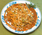 3. Das ?l in einer Pfanne über starker Flamme erhitzen, bis es zu rauchen beginnt. Die Paprikaschnitzel unter Rühren darin braten, bis sie gar sind. Herausnehmen und auf einer Platte beiseite stellen. Das ?l wieder auf etwa 180 Grad erhitzen, die Fleischschnitzel zugeben und sie braten, bis die Schnitzel voneinander gel?st sind. Dann werden die Ingwer- und Paprikaschnitzel sowie die Knoblauchspr?sslinge zugegeben und auch noch kurze Zeit gebraten. Zum Schluss die sü?e So?e und die Sojaso?e-St?rkemehl-Mischung darüber geben und unter Rühren alles ganz durchbraten.