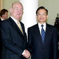 Der zum Besuch in Deutschland weilende chinesische Ministerpr?sident Wen Jiabao ist am Dienstag in Berlin mit dem deutschen Bundespr?sidenten Johannes Rau zusammengetroffen. Dabei sagte Wen, die gemeinsamen Interessen beider L?nder in den wichtigen Fragen über Frieden und Entwicklung der Welt seien immer mehr geworden.