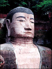 Die gro?e Leshan-Buddhafigur liegt am Zusammenflu? von Minjiang, Dadu und Qingyi am Fu? des Berges Lingyun ?stlich vom Emei-Gebirge. Sie geh?rt zu den Sehenswürdigkeiten des Gebietes vom Emei-Gebirge. Der überlieferung nach wurde dieser Buddha auf Initiative eines M?nches namens Hai Tong vom Lingyun-Kloster w?hrend der Tang-Zeit gebaut, um den tobenden Dadu-Flu?, der oft Schiffe zum Sinken brachte und Menschen verschluckte, zu b?ndigen und die Schiffahrt zu sichern. Der Bau dauerte insgesammt 90 Jahre. Die Buddhafigur steht in einer Felswand und blickt auf drei Flüsse hinab, den Minjiang, den Dadu und den Qingyi. Schon aus einer mehr als zehn Kilometern Entfernung ist sie sichtbar. Die Einzelheiten dieser Buddhastatue sind sehr genau in meisterhafter Technik herausgearbeitet. Zum Beispiel wurde ein von au?en unsichtbarer Abflu?kanal für das Regenwasser durch den K?rper gehauen, damit die Figur vor Verwitterung geschützt ist. Die gro?e Leshan-Buddhafigur ist 28 Meter breit und 71 Meter hoch. Der Kopf der Buddhafigur ist 14,7 Meter hoch und 10 Meter breit. Allein ein Buddha-Fu? hat eine Breite von 5,5 Metern und eine l?nge von 11 Metern. Auf einem Scheitel gibt es 1021 schneckenf?rmige Haarknoten, und auf jedem Knoten k?nnte ein gro?er Tisch Platz finden. Die Ohren dieses Buddhas sind 7 Meter lang.