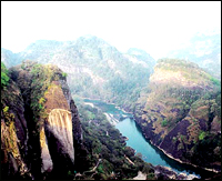 Der Fluss und dessen Umgebung ist die sch?nste Gegend des Landschaftsgebietes Wuyi. Die Touristen k?nnen mit dem Bambusflo? stromabw?rts fahren. W?hrend der neun Kilometer langen Fahrt sehen sie malerische Landschaften an beiden Seiten des Flusses.