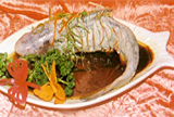 2. Den Porree in zwei Zentimeter lange Streifen schneiden und quer auf einem gro?en Teller auslegen. Den Fisch darauf legen und mit Fleisch-, Pilz- und Ingwerstreifchen bestreuen. Nun den Fisch mit dem Teller in einen gro?en Dampfkochtopf stellen, 15 Minuten lang d?mpfen und wieder herausnehmen.