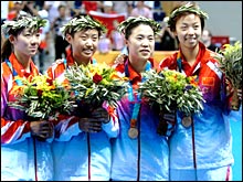 Das chinesische Duo Wang Nan / Zhang Yining hat am siebten Tag der olympischen Sommerspiele in Athen im Frauen-Doppel des Tischtennis-Wettbewerbs seine südkoreanischen Gegnerinnen, Lee Eun-Sil und Seok Eun-Mi, mit 4:0 besiegt und damit eine Goldmedaille gewonnen.