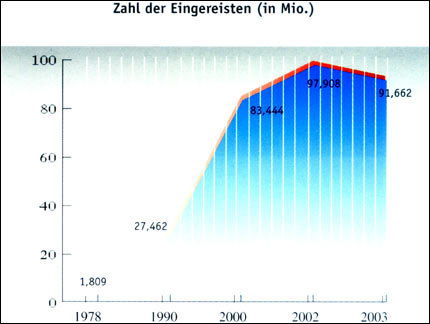 Die schrittweise Entwicklung der Reisen von chinesischen Bürgern ins Ausland macht aus China ein neues Ausreise-Land in der Asien-Region. Bis Ende 2003 sind 59 L?nder und Gebiete chinesischen Privatpersonen als Reiseziele freigegeben.