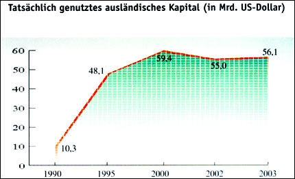 Es gibt zahlreiche Kan?le für die Nutzung ausl?ndischen Kapitals, die im Gro?en und Ganzen in drei Kategorien einzuordnen sind: 1. Anleihen vom Ausland einschlie?lich Darlehen ausl?ndischer Regierungen und internationaler Finanzorganisationen sowie Darlehen und Exportkrediten ausl?ndischer Handelsbanken und im Ausland emittierten Schuldverschreibungen. 2. Direkte ausl?ndische Investitionen einschlie?lich der Gründung von Unternehmen mit chinesischer und ausl?ndischer Kapitalbeteiligung, von Kooperationsunternehmen, von Unternehmen mit ausschlie?lich ausl?ndischem Kapital und der Durchführung von Projekten in Zusammenarbeit mit dem Ausland. 3. Anderweitige Investitionen aus dem Ausland einschlie?lich des internationalen Leasings, des Kompensationshandels, der Verarbeitungs- und Zusammenbaugesch?fte sowie der B?rsennotierung im Ausland. Zwischen 1990 und 2001 hat China Auslandskapital in H?he von 510,8 Milliarden US-Dollar tats?chlich genutzt, davon waren 378 Milliarden US-Dollar direkte ausl?ndische Investitionen. Im Jahr 2002 hat China Auslandskapital in H?he von 55 Milliarden US-Dollar tats?chlich genutzt, und damit ist China zu dem Land geworden, das in der Welt das meiste Auslandskapital absorbierte. 2003 haben die ausl?ndischen Investitionen, obwohl die chinesische Wirtschaft in der ersten H?lfte des Jahres durch die Seuche "SARS" beeintr?chtigt worden ist, ihr schnelles Wachstum beibehalten. China hat in diesem Jahr Auslandskapital in H?he von 56,1 Milliarden US-Dollar tats?chlich genutzt.