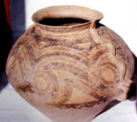 Der 45 cm hohe Topf, hergestellt aus einem Ton-Sand Gemisch, wird im Forschungsinstitut der Majiayao Kultur in Lanzhou, Hauptstadt der Provinz Gansu, aufbewahrt. Er hat einen kleinen Boden, der sich bis zum Bauch des Topfes auf 48 cm ausweitet, um sich dann zur ?ffnung hin erneut zu verkleinern. Der Topf ist mit schwarzen, gelben und roten Spiralmustern verziert. Die beiden schlangenf?rmigen Henkel winden sich vom Rand des Topfes zum weitesten Punkt auf dem Bauch, wo sie zwei schleifenartige Griffe bilden.