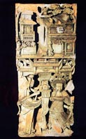 Eine andere Steinschnitzerei zeigt einen milit?rischen und einen zivilen Beamten, die ihrem Vorgesetzten einen offiziellen Hut überreichen, als Anerkennung für seine Bef?rderung.