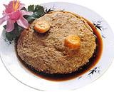 2. Das Eigelb in die Mitte der Fleischmasse setzen, die Sch?ssel in einem Bambusd?mpfkorb stellen und den Inhalt gar d?mpfen. Vor dem Servieren mit der Br?he und Sojaso?e betr?ufeln.