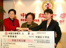 寫真(左):聯想集団(レノボ?グループ)が北京で開いた寄付金50萬ドルの贈呈式。中國赤十字の彭珮雲會長(寫真中央)、蘇菊香副會長(同左側)、聯想集団の王暁巖副総裁(副社長)らが出席した。