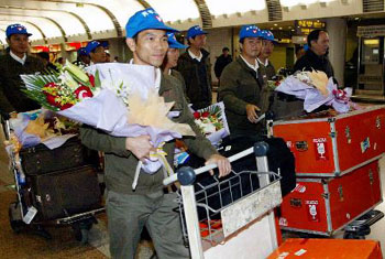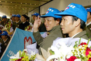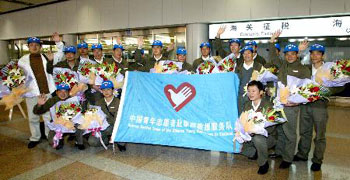 インド洋大津波で被災したタイで救援活動に參加していた中國青年ボランティア18人が8日帰國し、北京首都國際空港で熱烈な歓迎を受けた。