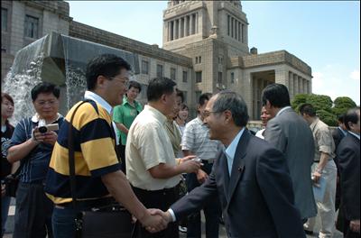 日本の超黨派の國會議員で組織される「日中新世紀會」が企畫した、中國人観光客向けの國會見學ツアーがこのほどスタートした。第1陣となる福建省の観光客らが國會議事堂を訪れ、一行を迎えた西博義?厚生労働副大臣(寫真前右端)と握手を交した。