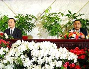 第10回全國人民代表大會(全人代)第1回會議は3月10日午後、人民大會堂で記者會見を行い、農業部の杜青林部長(左)と國務院発展研究センターの陳錫文副主任が農業と農村行政について記者の質問に答えた。