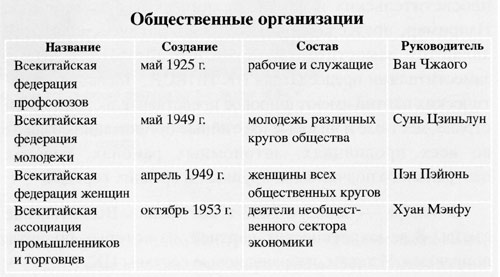 В Китае несколько тысяч общественных организаций. По Конституции и законам они самостоятельны в своей деятельности. Их первичные организации созданы в большинстве городов и сел. Организации играют важную роль в объединении и сплочении рабочих и служащих, молодежи, женщин, деятелей различных кругов страны, в налаживании общественных дел, участии в государственной и местной политической деятельности, защите законных прав и интересов широких масс.