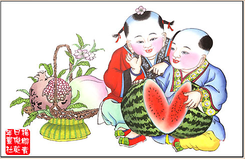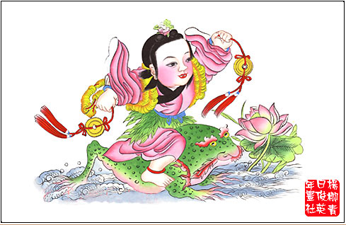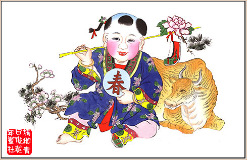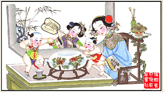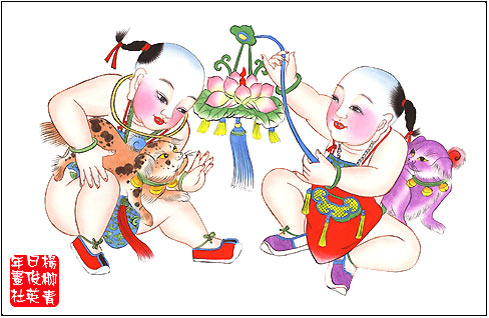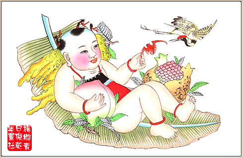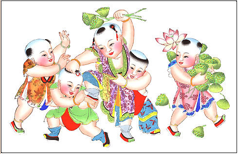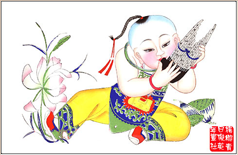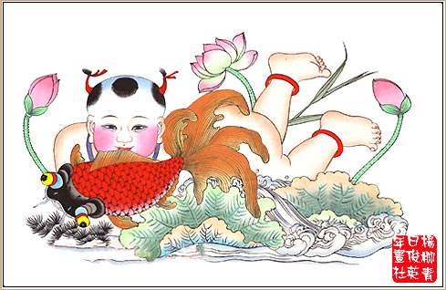 La pintura Nian Nian You Yu (Todos los a?os con cereales de sobra), representando un ni?o abrazando una carpa y con una flor de loto en la mano, significa la vida abundante y es divulgada ampliamente.