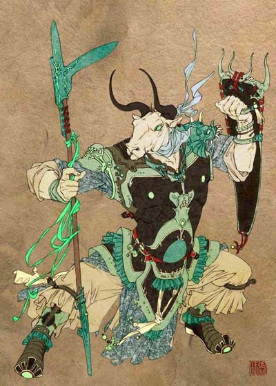Son dos esbirros del Rey del Infierno y fungen de mandaderos de la citación. El primero, originario del budismo, se llama también Apang, tiene la cabeza de buey y el cuerpo de humano, usa una horquilla de hierro grande y es capaz de desplazar cualquier monta?a. Fue condenado a tener esta forma física en el infierno porque no demostraba amor filial a sus padres cuando vivía en nuestro mundo. Luego de morir, se encarga de patrullar y buscar a los fugitivos. Algunos datos dicen que el budismo tenía al comienzo solamente al Cabeza de Buey, pero que a su introducción en China se le a?adió un compa?ero, el Cara de Caballo, ya que los chinos preferían tener las cosas en pares. Sin embargo, otros datos afirman que éste, alias Raksasa de Rostro Caballuno, también procedió del budismo.
