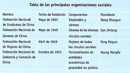 En China existen numerosas organizaciones sociales que, de acuerdo con la Constitución y las demás leyes, desarrollan actividades de forma independiente, tienen filiales en todas las ciudades y zonas rurales, agrupan y unen a empleados, jóvenes, mujeres y personalidades de los diversos círculos sociales del país, intervienen en la vida política estatal y local, coordinan asuntos públicos y sociales, y salvaguardan los derechos e intereses legítimos de las masas populares, desempe?ando en todos estos aspectos un importante papel.