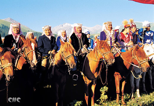 Mujeres kazakas del distrito de Xinyuan, Yili, asisten a una fiesta en la pradera