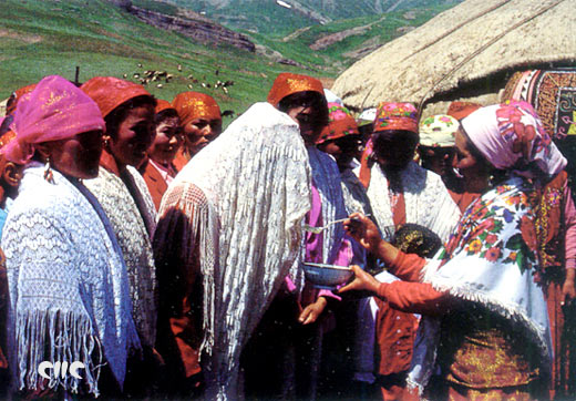 Kirguizos de la prefectura de Kizilsu, en una ceremonia de recepción de la novia