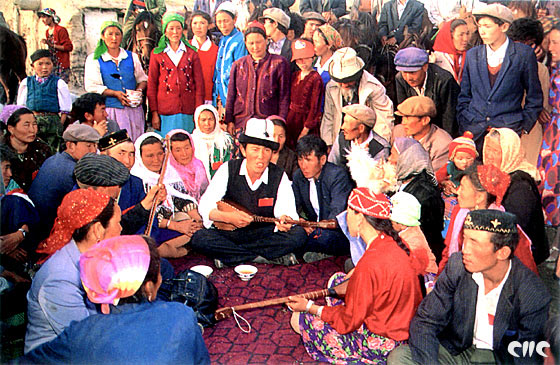 Kazako cantando y rasgueando un instrumento de cuerda de su etnia